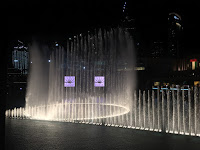 Una de las atracciones imperdibles de Dubai: una fuente de casi 300m. de longitud que dispara agua a 150 metros de altura, con casi 7.000 focos y que se mueve al ritmo de la música mientras todo el frontal del Burj Khalifa se ilumina de muchos colores y dibujos. El dibujo de la fuente iluminada, desde la planta 148, resultaba caprichoso. La ponen cada 30 min. y la expectación es máxima. Uno no se cansa de verlo.